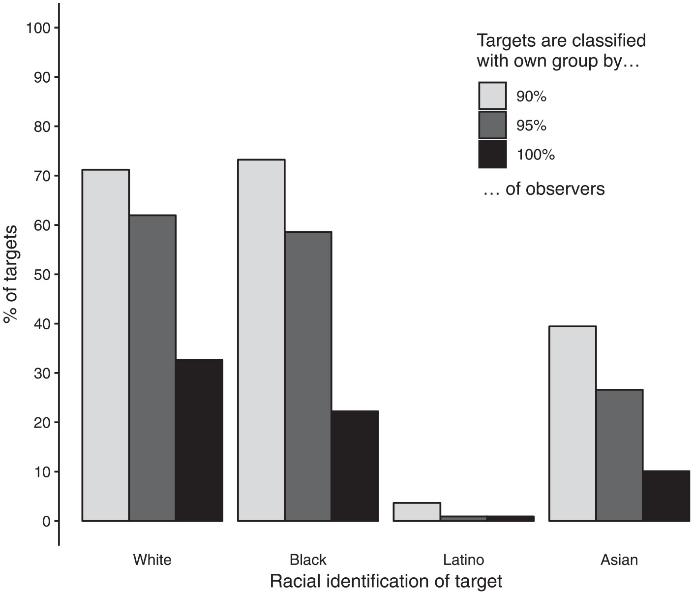 [S]elf-identified Latinos, who are themselves heterogeneous in terms of ancestry and phenotype, are probably the primary source of racial ambiguity in the United States today. A look at a racially diverse face database makes the point. The Chicago Face Database (CFD) … is a publicly available database of nearly 600 people who self-identify as White, Black, Latino, or Asian …[C]oncordance between self- and other-classification is lowest for self-identified Latinos. Concordance is highest for self-identified Whites and self-identified Blacks.