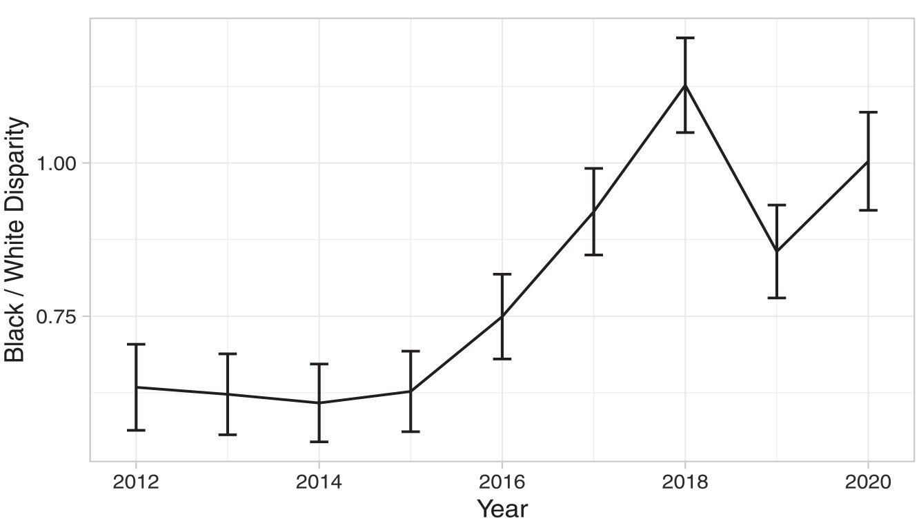 After Trump’s election, White officers exhibited a substantial increase in their likelihood of searching Black motorists relative to White motorists … To test whether the behavior of individual officers changed, I calculate the yearly change in the Black/White disparity using an officer fixed effect … The results indicate that the same White officers became more likely to search Black motorists compared to White motorists after 2016. Next, I test whether officers hired after 2016 showed a different Black/White disparity compared to those working in 2016 or earlier … The results indicate that White officers hired after 2016 do not exhibit an additional propensity to search Black motorists when compared to White officers hired before 2016. Taken together, these results suggest the behavior of individual White officers changed throughout the study period.