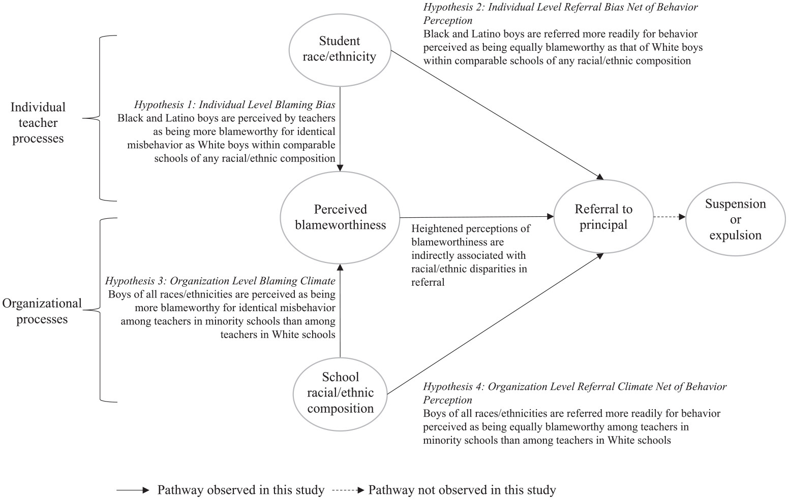The idea that organizations, such as schools, serving predominantly Black and Latinx individuals are surveilled differently than organizations serving White people has been widely referenced in the literature … Yet, extant studies have been unable to rigorously standardize behavior and situational context across both student race/ethnicity and organizational demographic composition to rule out the possibility that differential surveillance reflects differences in student behavior across contexts. This limitation has left the scholarly and policy communities without the empirical evidence needed to understand how behavioral perceptions and responses can vary both among individuals (e.g., teachers evaluating identical misbehavior by Black or Latino versus White boys) and organizations (e.g., related to school-level student demographic composition).